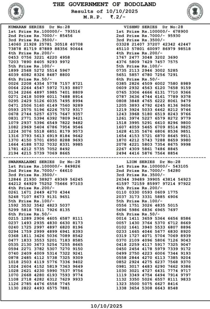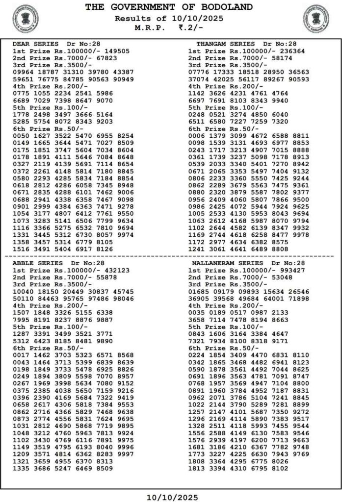 Bodoland Lottery Today Result 3PM 11.10.2025 Assam State Lotteries: Good day my dear friends there you are in this post is about for the Bodoland Lottery 3pm day result and dear friends there you are in this specail post and all the other diffenret posts can be daily been updated with the latest lottery sambad results and friends if you needs the fastest delivery of the results then do us been created shortcut as the site name which has been known to be as Nagaland state lottery and its the another great morning of lovely weekend means Saturday 11th of October 2025 its lovely days peoples most searched sambad lottery which will be told to be as it will be Bodoland Lotteries and the result will be available at 3:10pm here you can get the chance to win the 1CR rupees an friends we also provided you the most awesome Sikkim state lottery, West Bengal state lottery, Nagaland State Lottery and this site known as Lottery Sambad.